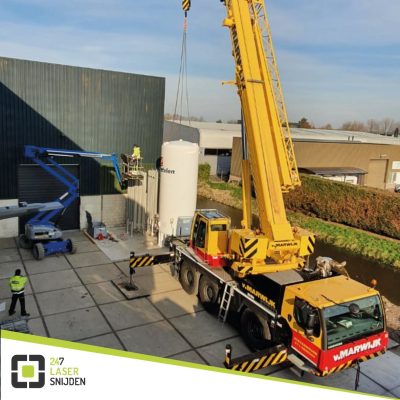 De installatie van de stikstoftank voor het nieuwe pand van 247 Lasersnijden is in volle gang.